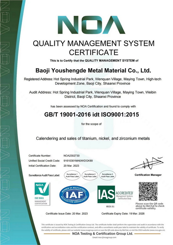 宝鸡头号玩家官网登录入口金属材料有限公司地处“中国钛谷” ——陕西省宝鸡市高新技术开发区,现有专业生产技术人员50余人,公司通过了ISO9001:2015质量管理体系。